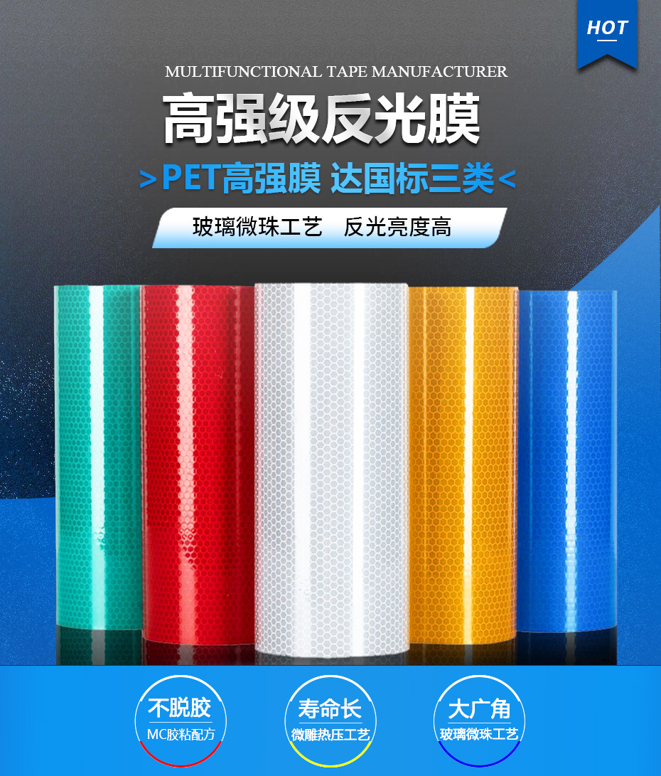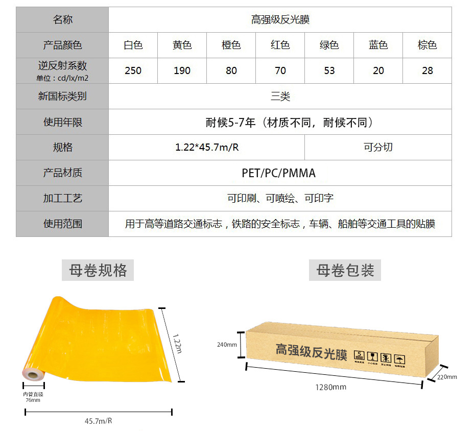 【產品材質】PET/PC/PMMA,反光性能優異,可用於各種公路,鐵路,航道和城市主幹道的交通標誌導向牌,指示牌,礦山機場安全牌,以及(jí)車(chē)輛,船舶的車(chē)身反光貼膜